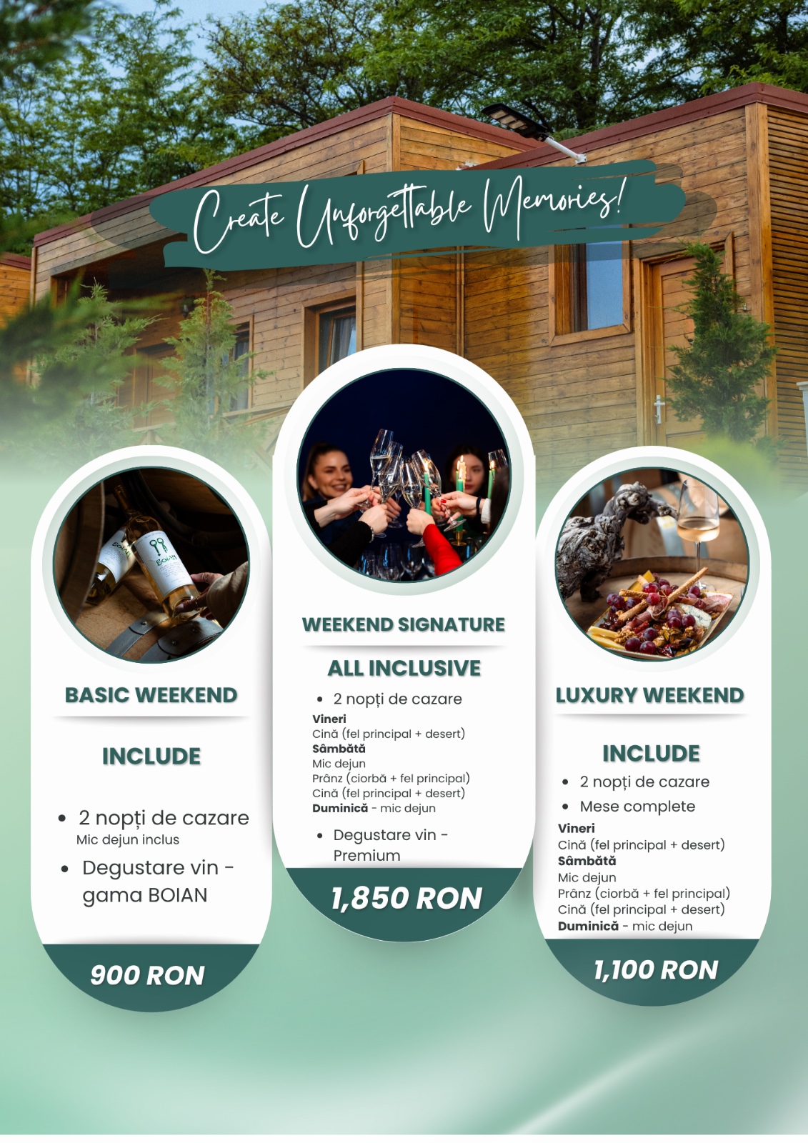 Am creat o selecție de pachete gândite pentru orice ritm. Fie că îți dorești un sejur relaxant cu degustare, un weekend fără griji în regim all inclusive sau o experiență completă de răsfăț în doi. Fiecare pachet îți oferă ocazia de a încetini, de a savura preparate atent pregătite și de a transforma timpul petrecut aici într-o amintire frumoasă.